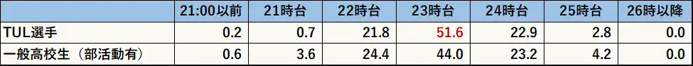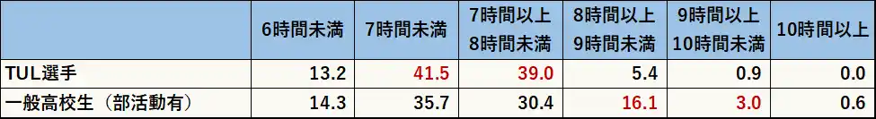 TUL選手は7時間未満の睡眠が多く(41.5%)、一般高校生より短い傾向にあります。就寝時間は両者とも23時台が最も多く(TUL:51.6%、一般:44.0%)、深夜帯(24時以降)の就寝も約25%存在します。TUL選手は一般高校生と比べて、より短時間睡眠で、就寝時間もやや遅い傾向が見られます。 |