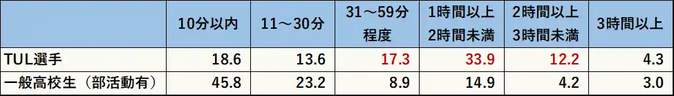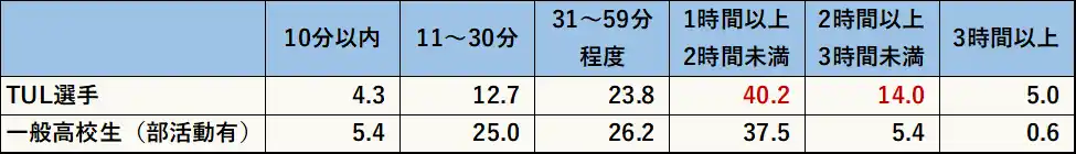 ■通学時間はTUL選手の約6割が1時間以上で、2時間以上も19%存在し、一般高校生より長時間。 |