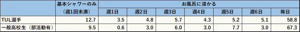 TUL選手と一般高校生の入浴習慣を比較すると、毎日お風呂に浸かる割合は一般高校生が67.3%とTUL選手(58.8%)を上回っています。一方、基本シャワーのみの利用はTUL選手が12.7%と、一般高校生(9.5%)より高くなっています。週に数回お風呂に浸かる習慣については、TUL選手の方が全体的に均等に分布しており(3.5%~5.7%)、一般高校生は週5日(7.7%)と週3日(6.0%)に比較的集中しています。これらの数値から、TUL選手は時間的制約などにより、より簡便な入浴方法を選択する傾向にあることが分かります。 |
