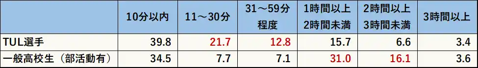 学習時間の分布を比較すると、TUL選手は30分以内の短時間学習が61.5%(10分以内が39.8%、11-30分が21.7%)を占めています。一方、一般高校生では1時間以上の学習が50.7%(1-2時間が31.0%、2-3時間が16.1%、3時間以上が3.6%)を占め、より長時間の学習傾向が見られます。両者の学習時間パターンには明確な違いがあることがわかります。 |