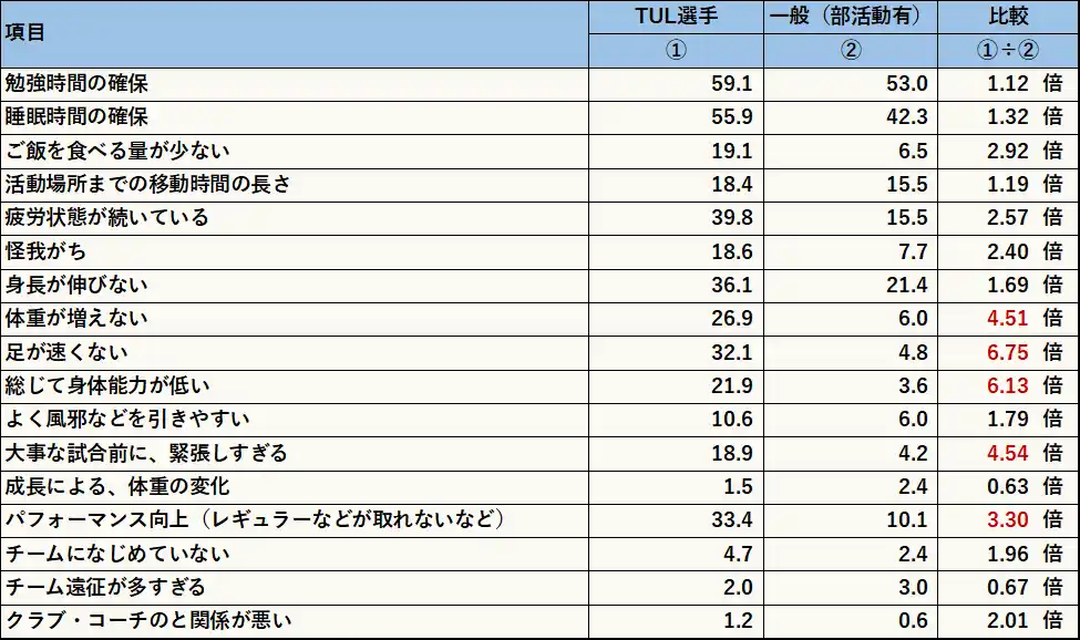 図表3:部活動をする上での悩み・課題(TUL選手、一般高校生比較) 単位:%、倍 |