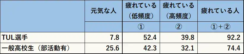 ■TUL選手の92.2%が疲労を感じており、一般高校生より18ポイント高い深刻な疲労状態にある。 |