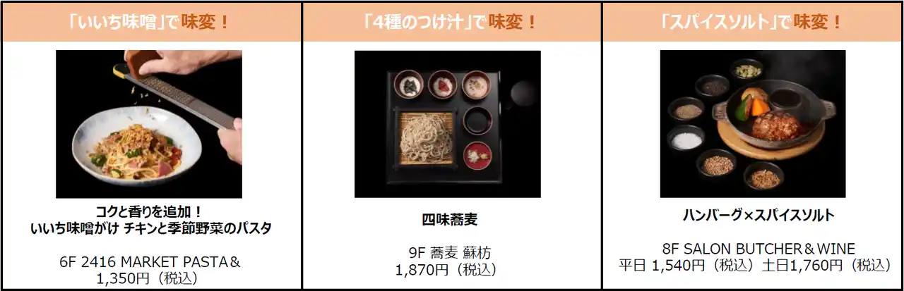 こだわりの「いいち味噌」をかけてコクと香りをプラスするパスタや、4種のつけ汁で味変を楽しむ四味蕎麦、エスプレッソとビールをかけ合わせた大人のオリジナルカクテルなど、ひと味違うメニューを計24ショップで展開します。 |
