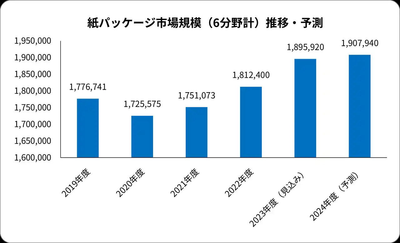 さらに、環境への配慮による「紙化」の流れが追い風となり、市場は緩やかな成長を続けると予測されています。2024年度の紙パッケージ市場規模(6分野合計)は、前年度比0.6%増の1兆9,079億4,000万円と見込まれており、2030年度には2022年度比で約10%の成長が期待されています。中長期的にも、堅調な拡大が続く見通しです。 |