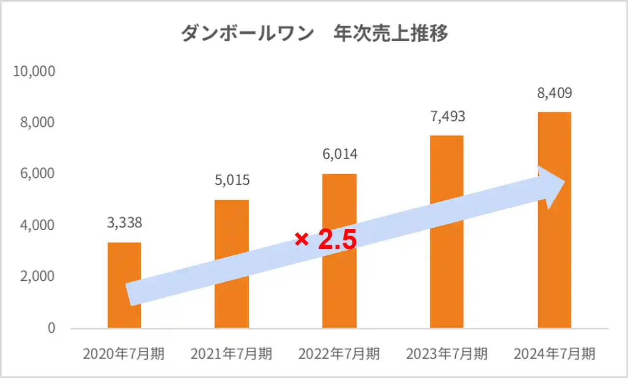 当社が運営する梱包資材専門の通販プラットフォーム「ダンボールワン」も、市場の成長とともに、売上を順調に伸ばしています。2019年7月期には売上高23億円という規模でしたが、2024年7月期には84億円に到達しています。 |