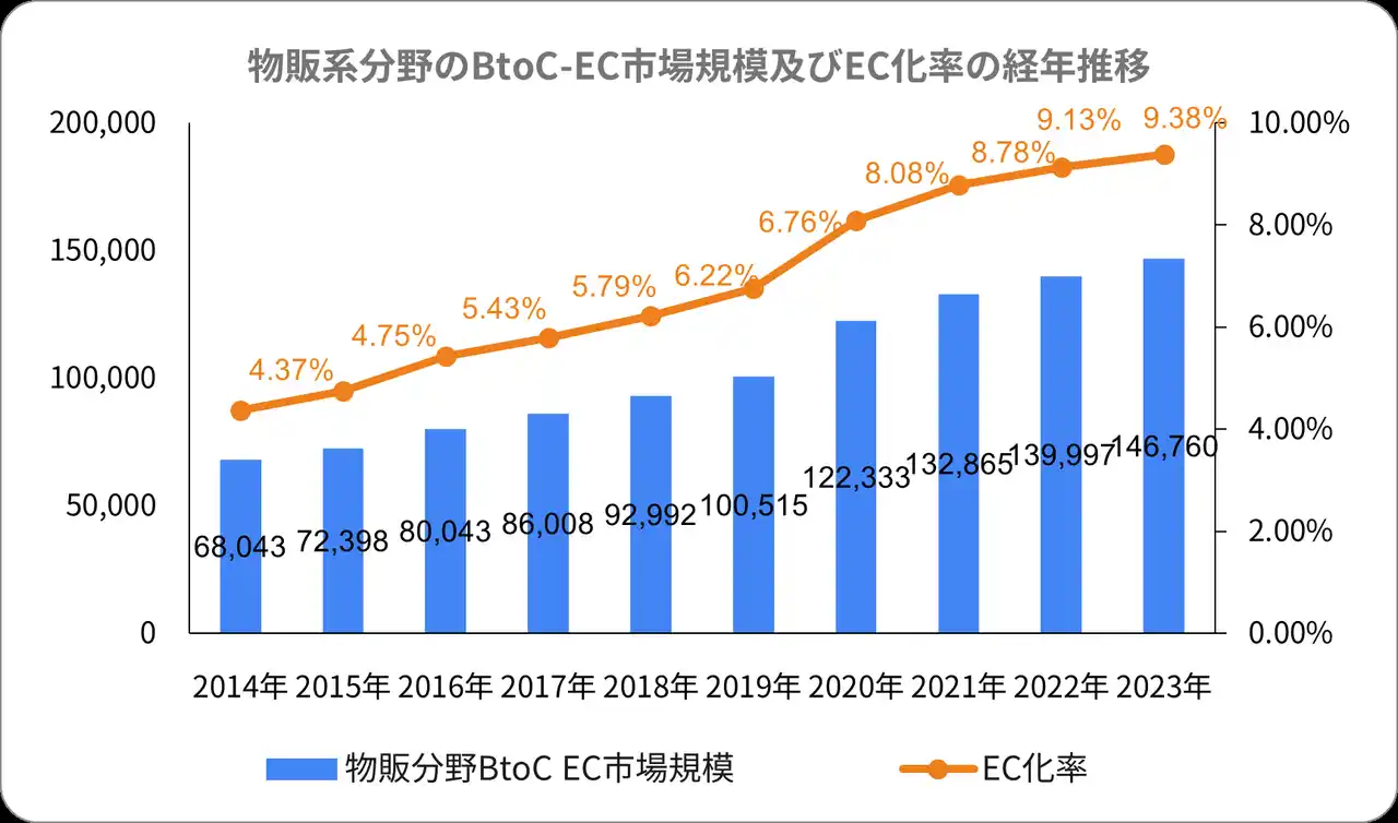 物販系分野におけるBtoC-EC市場は年々拡大を続けており、2023年度には14兆6,760億円に達しました。EC化率も同年度で9.38%となっており、国内の商取引における電子化が着実に進んでいることがうかがえます。 |