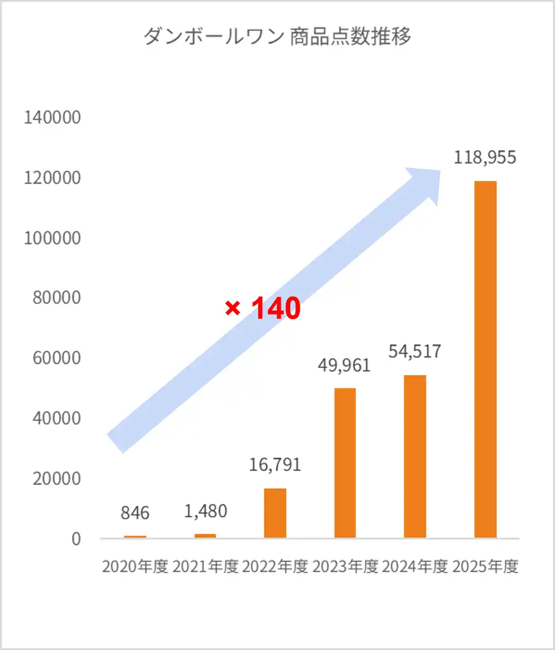 ダンボールワンは1978年創業の梱包資材メーカーで、2005年から段ボールのEC販売を開始しました。小ロット・即日出荷を強みとし、2022年にラクスルの完全子会社となりました。その後、2025年度第3四半期に当社調達プラットフォーム「ラクスル」とのID統合が完了し、同一アカウントでユーザーがダンボールワンの梱包材を購入できるようになりました。現在、約11万点の商品を扱い、2025年には会員数80万人を突破。独自の製造ネットワークと、ネット完結型の注文システムで段ボール・梱包材通販サイトとして7年連続No.1(*1)の地位を築いています。 |