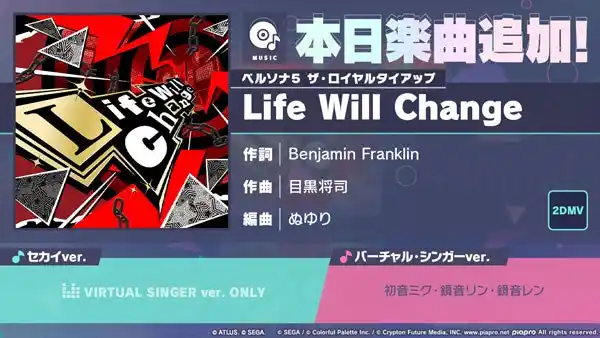 「Life Will Change」(作詞:Benjamin Franklin、作曲:目黒将司、編曲:ぬゆり)を、『プロジェクトセカイ』の新たなリズムゲーム楽曲として追加いたしました。 |