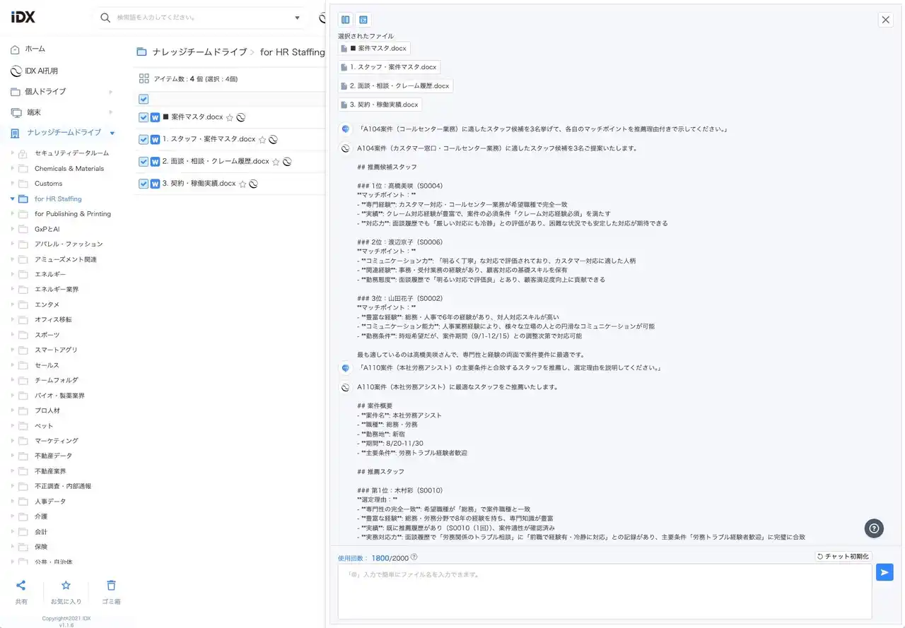 → 面談メモ・クレーム対応記録・採用要件などの非構造データをナレッジDB化し、横断検索、該当履歴の要点を要約。類似事例の引き出しや業務の引き継ぎに活用。 |