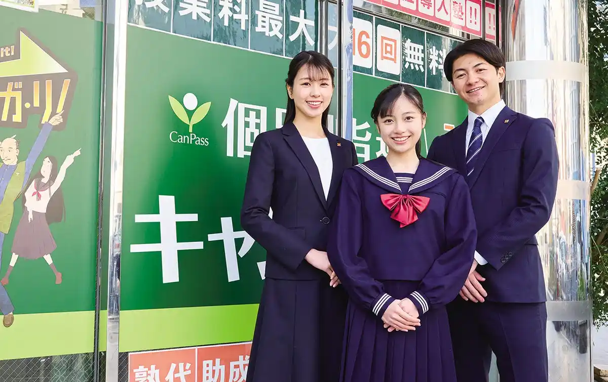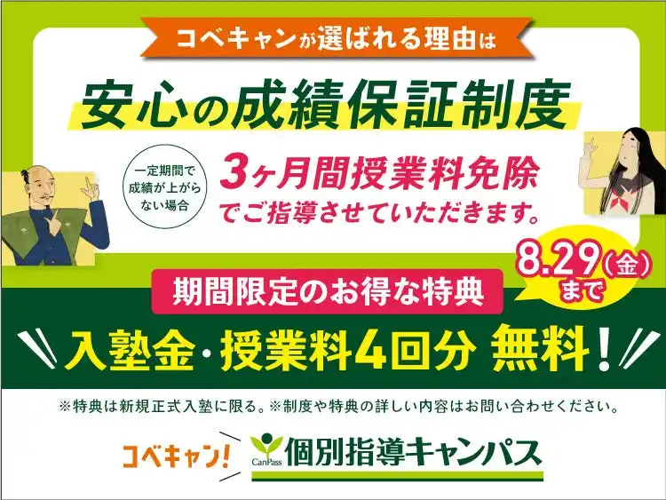 「コベキャン」「キャンパス」の愛称でおなじみの個別指導キャンパスは、低価格で高品質な個別指導塾です。他の個別指導塾の6割程度の授業料を創業当初から維持しています。大阪・兵庫・京都・滋賀・奈良・愛知・愛媛・東京・千葉・埼玉・福岡に直営校舎を展開中。成績が上がらなければ3ヶ月間授業料免除となる成績保証制度を業界でもいち早く導入し、「絶対に成績を上げる」をモットーに、地域に密着した教室展開をしています。当塾の8割が友人同士の紹介や口コミからのご入塾で、高い評価をいただいております。 |