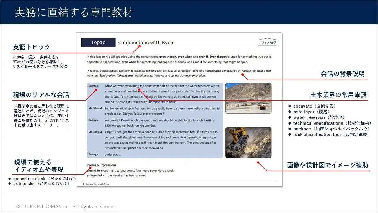 建築・土木・不動産業界向け英語研修プログラム「オフィス留学」を提供するツクルロマン株式会社(本社:東京都港区、代表取締役社長:関根 謙太)は、土木関連企業からのニーズに応え、土木専門教材を10月からリリースいたします。 |