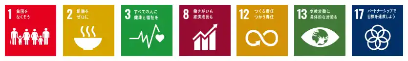 本活動は、使用済みペットボトルキャップを分別・回収し、再資源化することで、CO2排出量の削減や限りある資源の有効活用を図るものです。加えて、キャップの売却益は、子ども食堂プロジェクトや医療支援活動などへの寄付に活用される仕組みとなっており、環境保全と社会貢献の両面に資する取り組みです。エコキャップ活動に取り組むことにより、SDGsの17のゴールのうち、以下の目標の達成に結びつけてまいります。 |