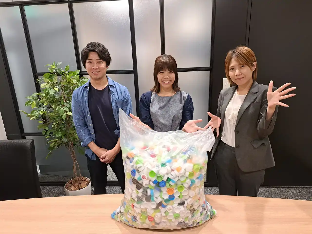 事業所ごと(札幌(2拠点)、東京、福岡、大阪、仙台)にペットボトルキャップの回収を募り、多くの従業員がエコキャップ活動に賛同し、活動に協力してくれました! |