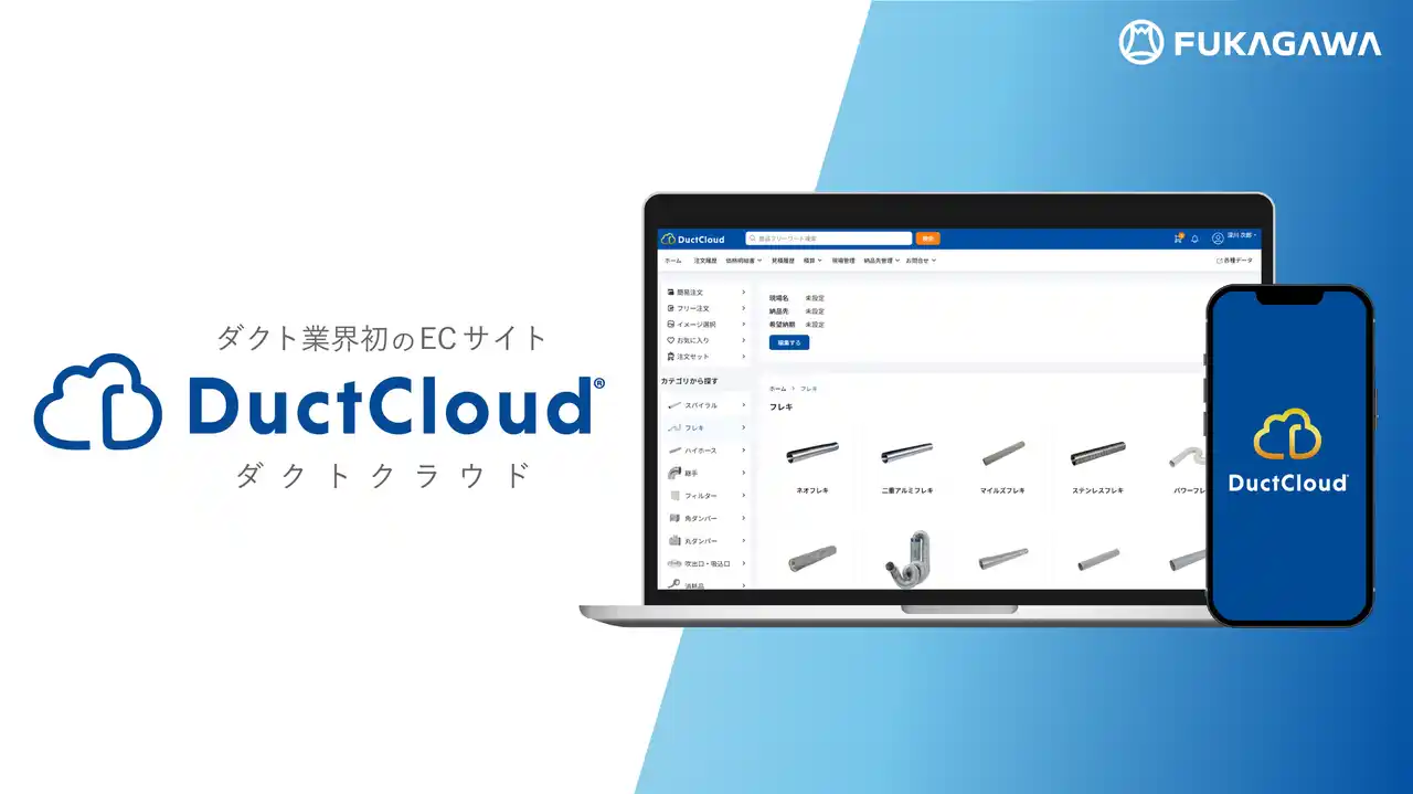 「DuctCloud」は、株式会社フカガワが自社開発した、ダクト業界初の専用ECサイトです。365日・24時間、いつでも・どこでも、ダクト部材のご注文や管理が可能です。 |