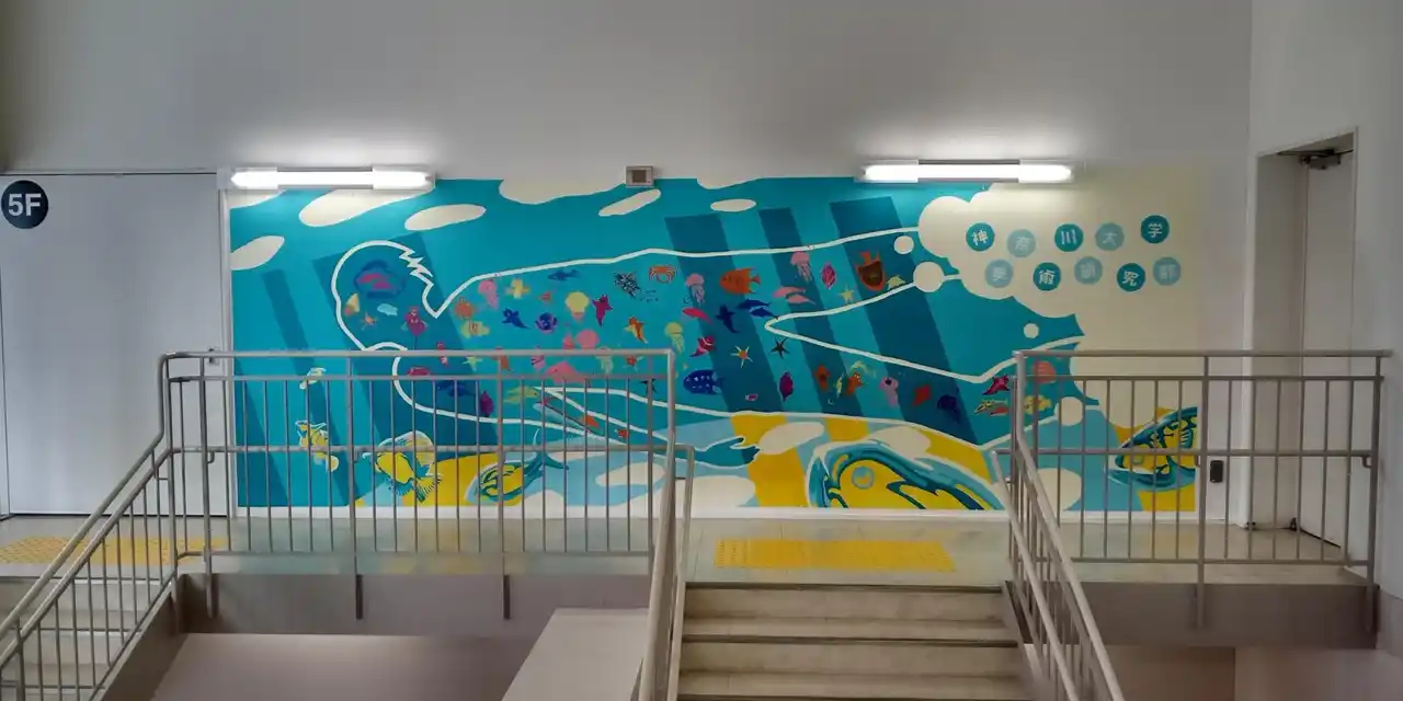 横浜ベイクォーターは、「アート&デザインの街」をコンセプトとしたヨコハマポートサイド地区にあることから、2022年4月より、作品の展示やワークショップ等を通じてアートをもっと身近に感じてもらえるよう(株)メイビスと連携して、「アートフルヨコハマプロジェクト」をスタートしました。そのプロジェクトの一環として、神奈川大学美術研究部の学生たちがデザインした壁画に、来館したお客様が絵を書き加えていく参加型イベントを2023年より実施。好評だったことから本年も8月16日(土)、17日(日)の2日間で開催することとしました。今回は「水中のうちゅう」をテーマに、大きな鯨の背中にカラフルな星を来館したお客様に思い思いに描いていただき、1つの作品を完成させます。 |