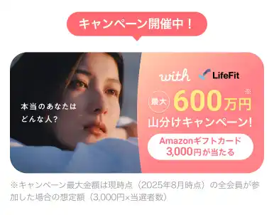 本キャンペーンは、LifeFit会員の皆さまを対象に、価値観マッチングwithが監修する診断ラボ「キミペディア」にアクセスの上、withで人気の「超性格分析」を体験し、キミペディアLINE公式アカウントを友だち登録してキャンペーンにお申し込みいただいた方の中から、抽選で50人に1人に3,000円のAmazonギフトカードが当たる特別企画です。 |