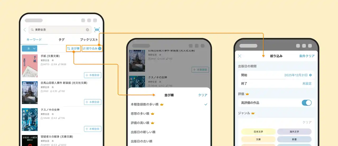 ブクログ独自のジャンルから本を探したり、ユーザーからの注目が高い本や読後の評価が高い本に並び替え・絞り込んだりすることで、よりスムーズに好みの本に出会うことができます。 |