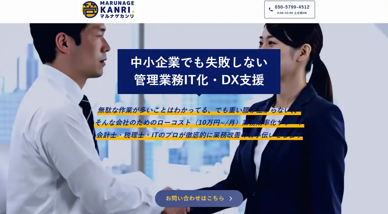 『クラウドDX支援』は、バックオフィス業務の効率化に特化してきたマルナゲカンリグループが提供する、中小企業向けのクラウドシステムを活用したIT化・DX(デジタルトランスフォーメーション)支援サービスです。 |