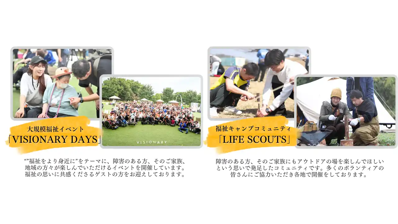 販売されるチャリティグッズの収益は、障害のある方やそのご家族が自然体験を通じて豊かな時間を過ごす『LIFE SCOUTS』活動と大規模福祉イベント『VISIONARY DAYS』にて活用されます。購入されたチャリティバッグの収益がイベント運営費の補助につながるなど、「自分が選んだ商品が、誰かの笑顔につながっている」ことを実感していただける内容です。 |