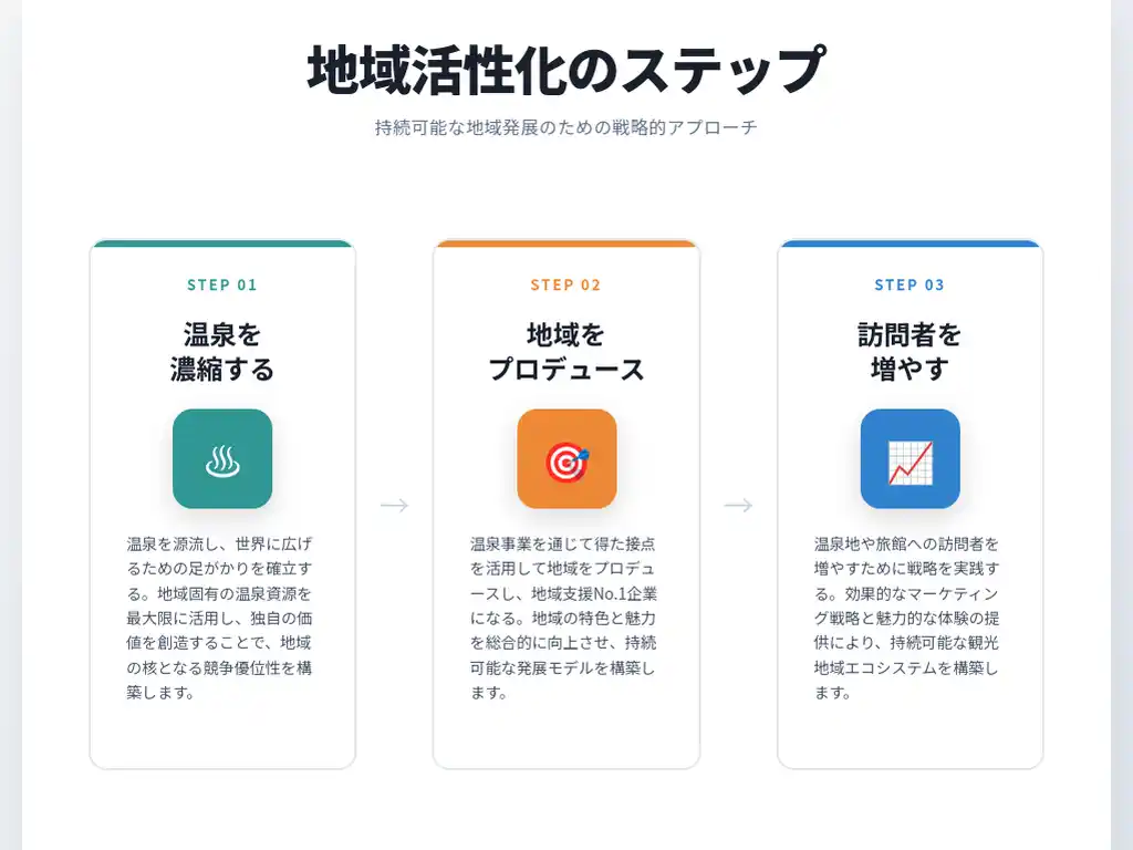 第一弾プロダクト「濃縮温泉入浴剤」: 全国の温泉旅館と提携し、現地で製造した濃縮温泉を家庭用入浴剤として販売します。化学合成成分で作られた従来の入浴剤とは一線を画し、「本物の温泉体験」を提供します。これにより、旅行が困難な高齢者や介護施設の入居者、多忙なビジネスパーソンにも、本物の温泉が持つ癒やしと効能を届けます。 |
