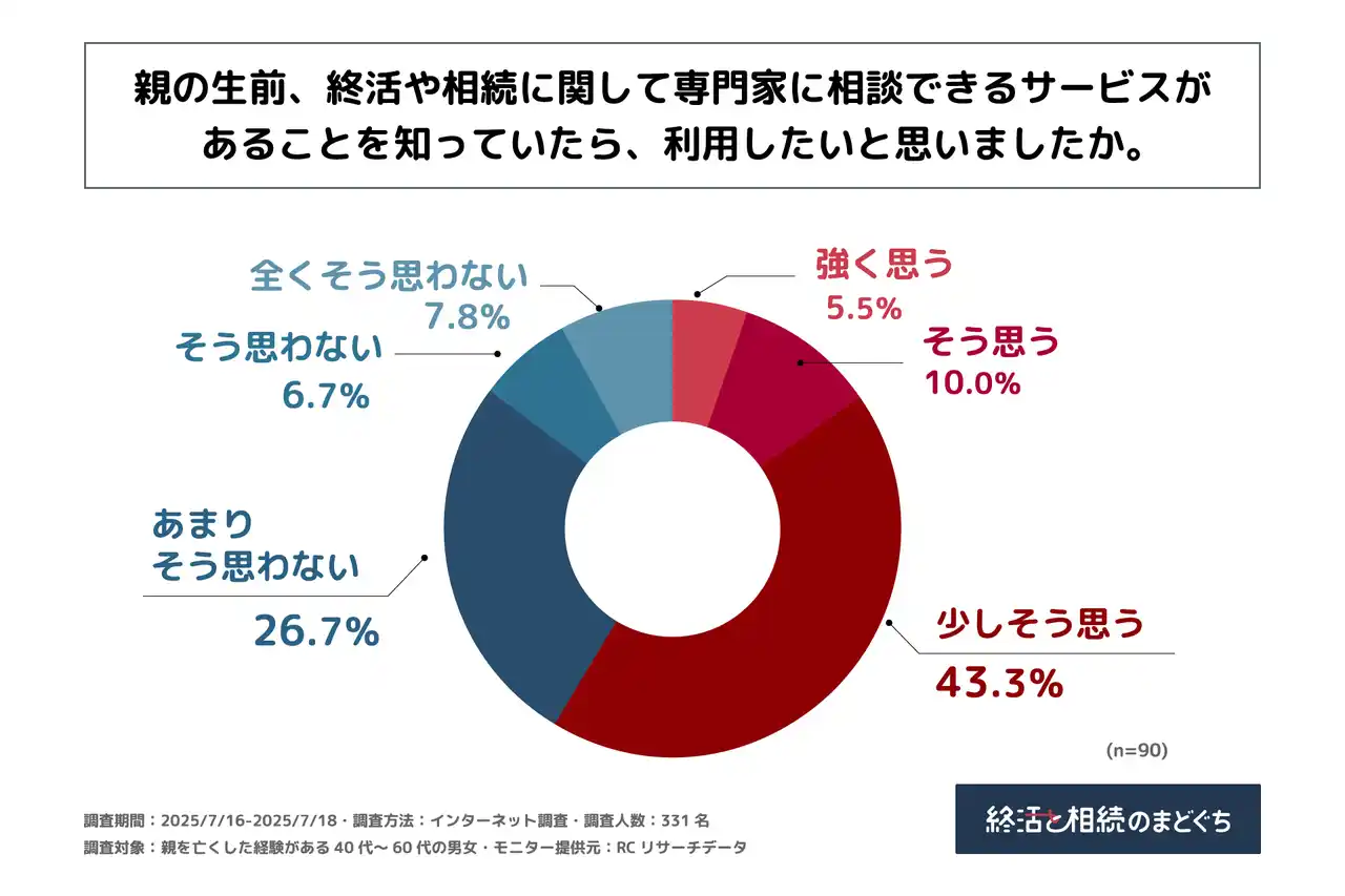 ・親と終活や相続について話したいと思ったができなかった人の半数以上が、親の生前、終活や相続に関して専門家に相談できるサービスがあることを知っていたら少なからず利用したいと思うと回答 |