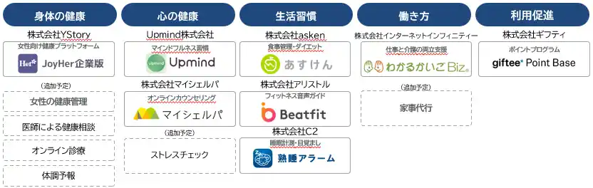 ※身体の健康、心の健康、生活習慣、働き方、利用促進は当社独自の分類です。 |