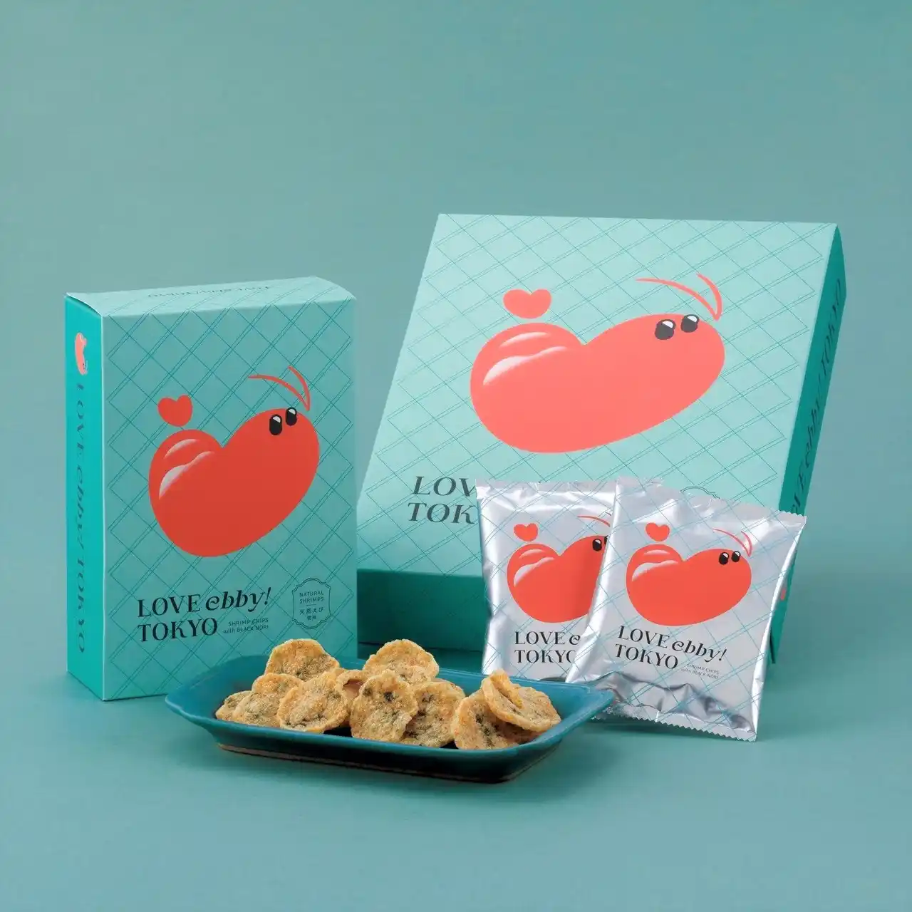 〈LOVE ebby! TOKYO〉のインパクト抜群なパッケージの中身は、こだわりが詰まったサクッと食感のエビチップスです。 |