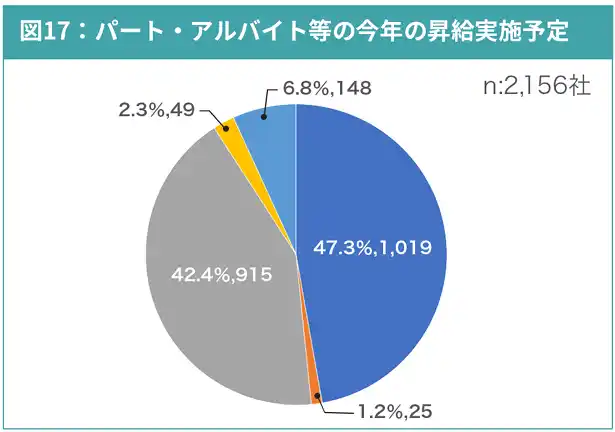 一方、パート・アルバイトに対する昇給については、制度的整備が進んでいない企業も多く、「昇給を実施しない」企業が約4割にのぼる一方で、「最低賃金の引き上げに合わせて対応する」といった制度外の柔軟な対応も見られた。 |