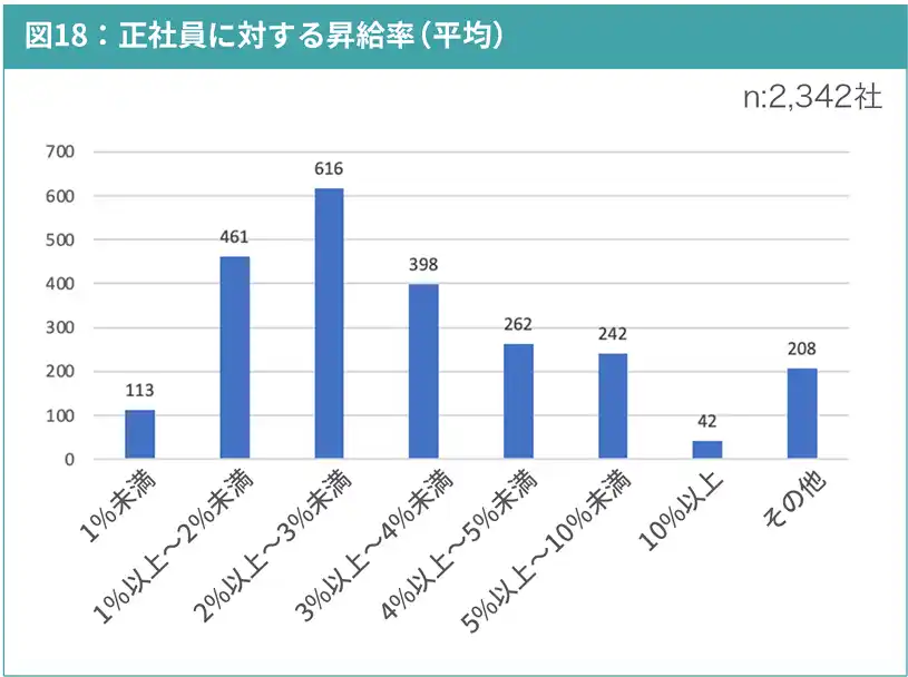 昇給率は「2~3%未満」が最も多く、全体の26.3%を占め、前回に続きこの水準が全体の中心値となっている。「1~2%未満」「3~4%未満」も含めた「1~4%未満」ゾーンで約7割を構成しており、業種地域を問わず、堅実かつ継続的な昇給が主流となっている。 |