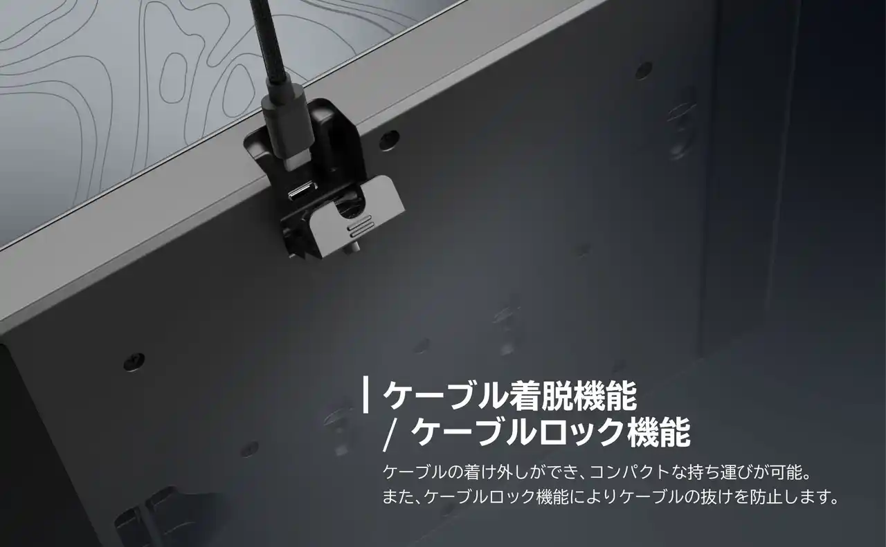■ケーブル着脱機能 / ケーブルロック機能 ケーブルの着け外しができ、コンパクトな持ち運びが可能。 また、ケーブルロック機能によりケーブルの抜けを防止します。 |