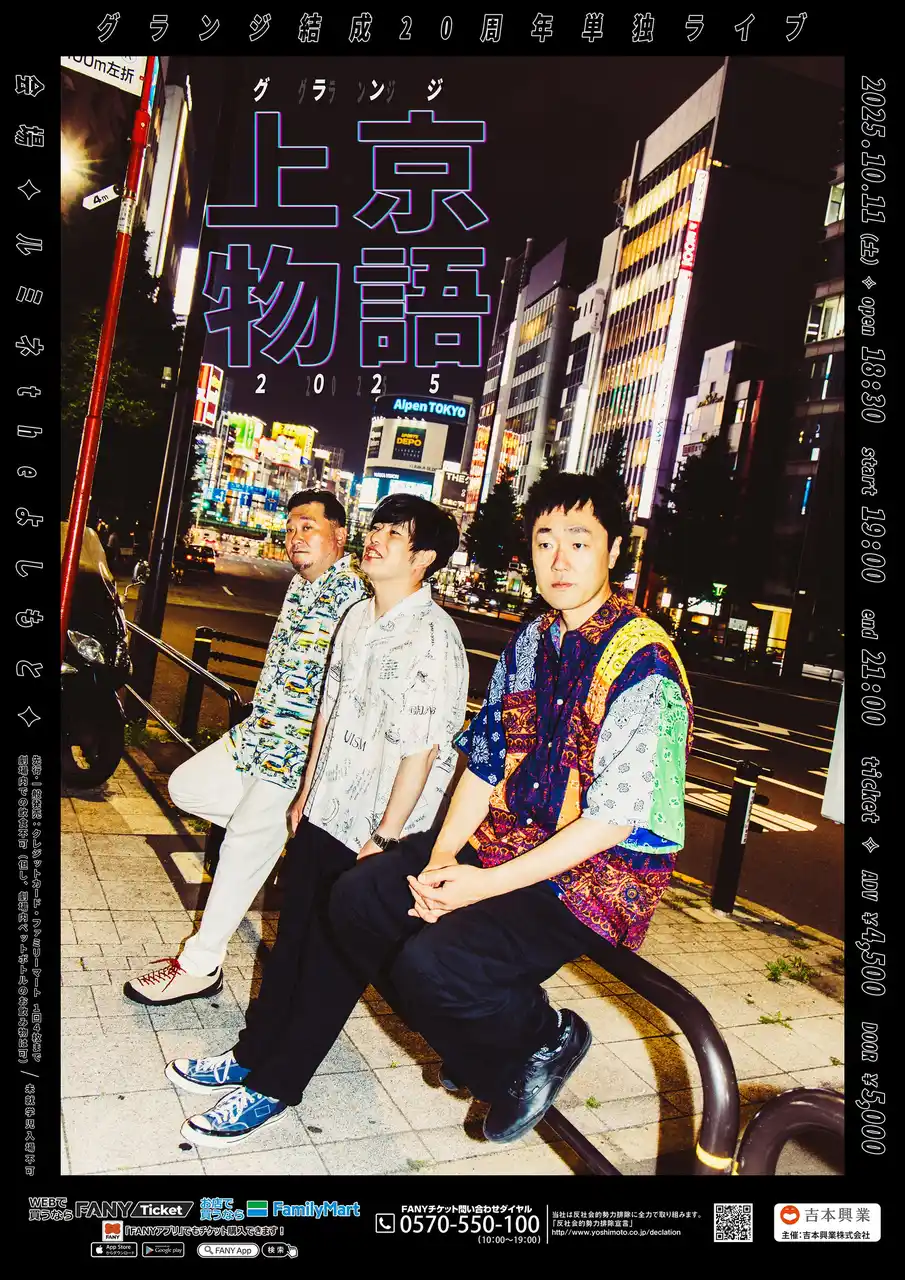 | このたび、グランジ結成20周年を記念し、約5年ぶりとなる単独ライブ『グランジ上京物語2025』を、10月11日(土)にルミネtheよしもとにて開催することが決定しました。 | ||||||||||||||||||||