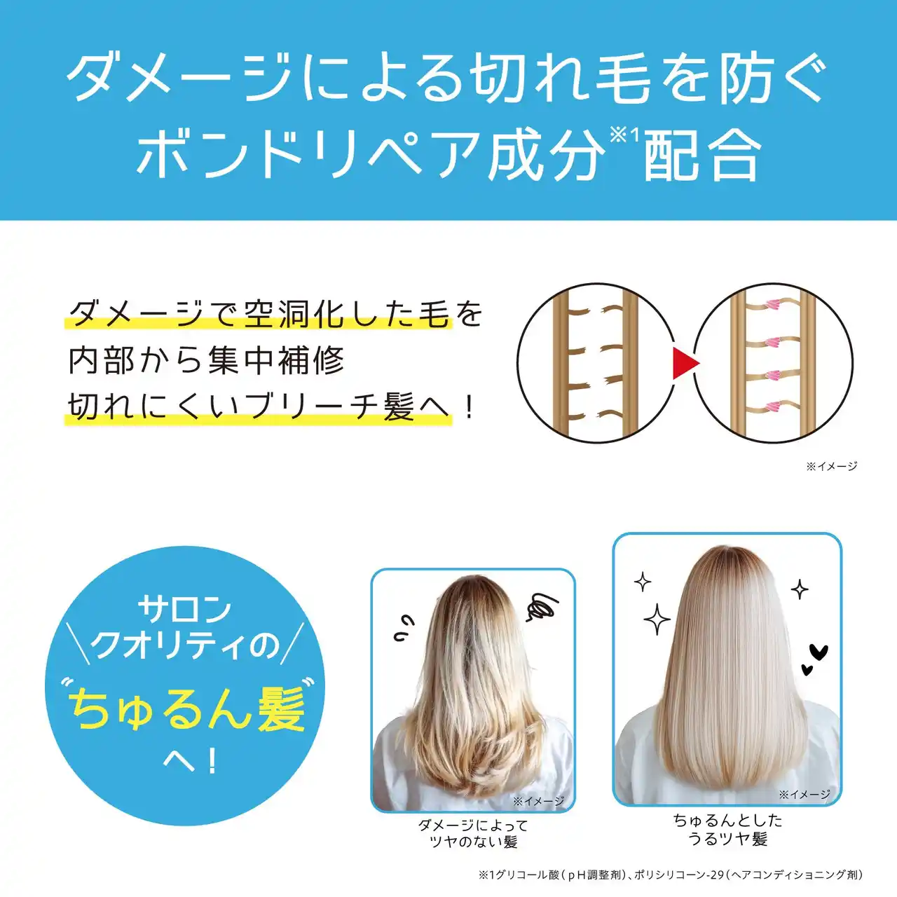 カラーやブリーチによって損傷した毛髪を修復するボンドリペア成分※2配合。カラーやブリーチによるダメージで空洞化した毛を内部から集中補修し、切れにくいブリーチ髪へ |
