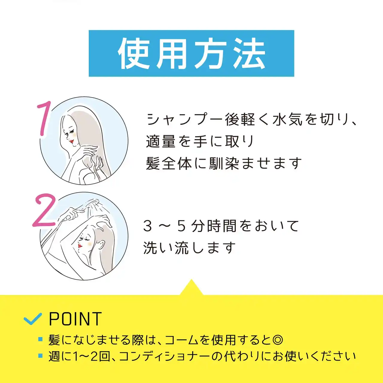 1.シャンプー後軽く水気を切り、適量を手に取ち髪全体に馴染ませます。 |