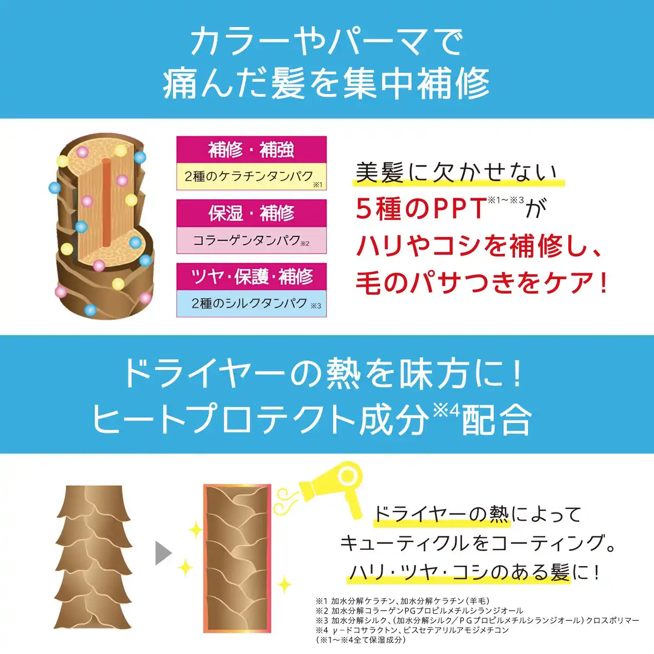 美髪に欠かせない5種類のPPT<補修・補強に効果的な2種のケラチンタンパク※3>、<保湿・補修に効果的なコラーゲンタンパク※4>、<ツヤ・保護・補修に効果的な2種のシルクタンパク※5>をバランスよく配合。カラーやパーマで傷んだ髪のハリやコシ、毛のパサつきを緩和します。 |