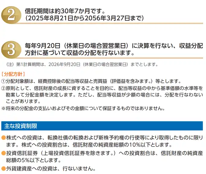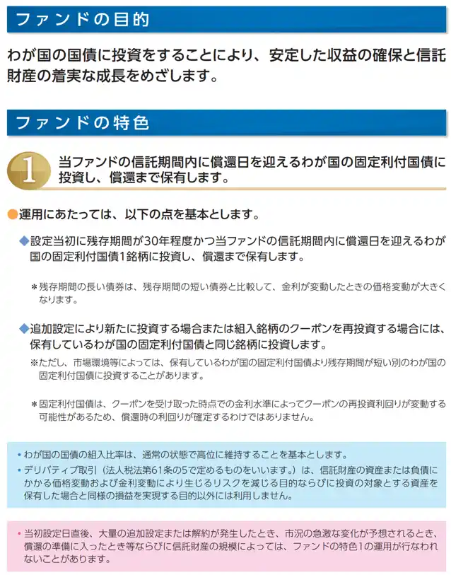 当ファンドは、当初の残存期間が約30年の超長期国債に投資し、償還まで保有する投資信託です。超長期国債に少額から投資することが可能になります。 |