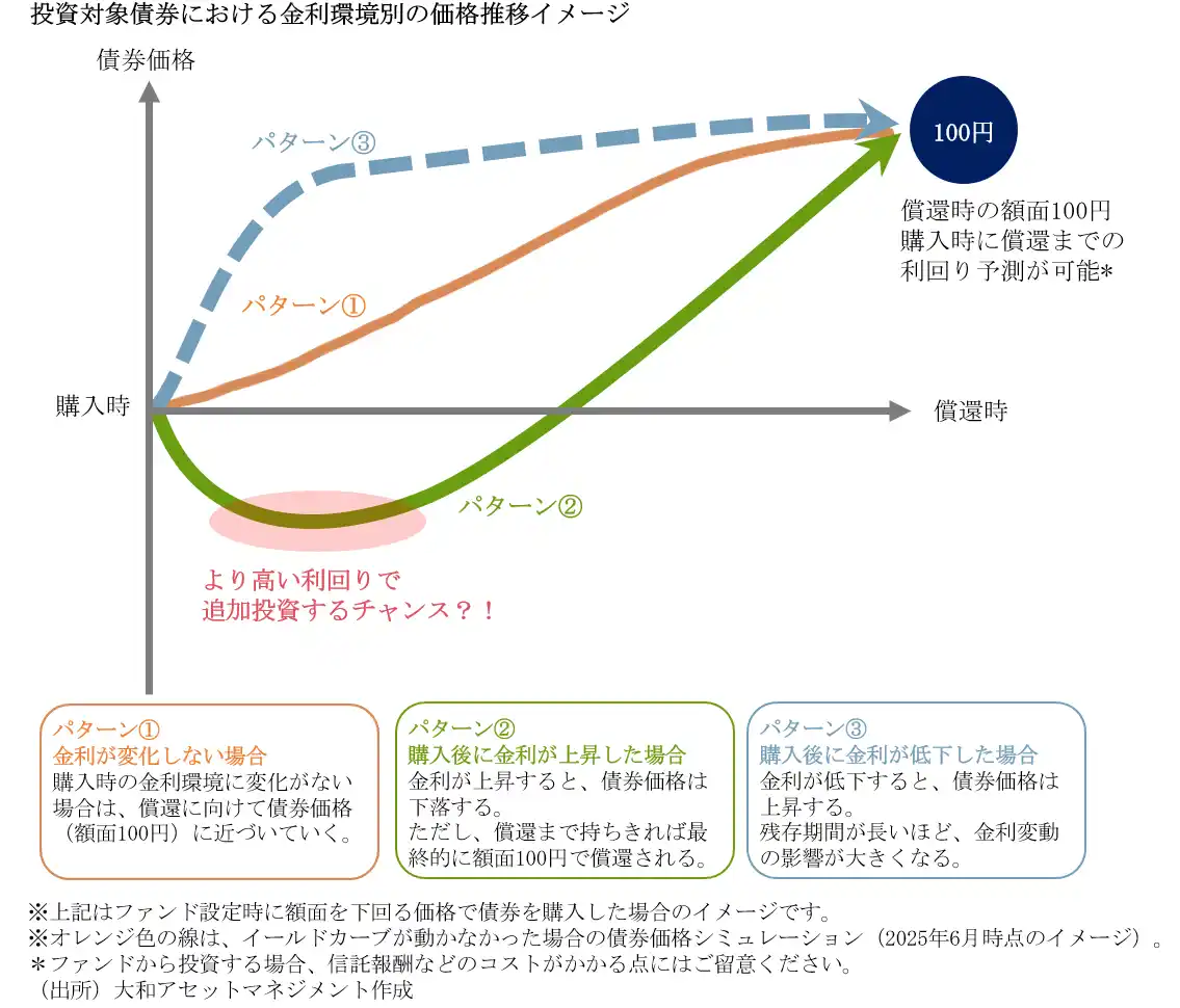 また、金利が低下(債券価格が上昇)した時は値上がり益が期待でき、逆に金利が上昇(債券価格が下落)した際には、より高い利回りで追加投資するチャンスにもなります。 |