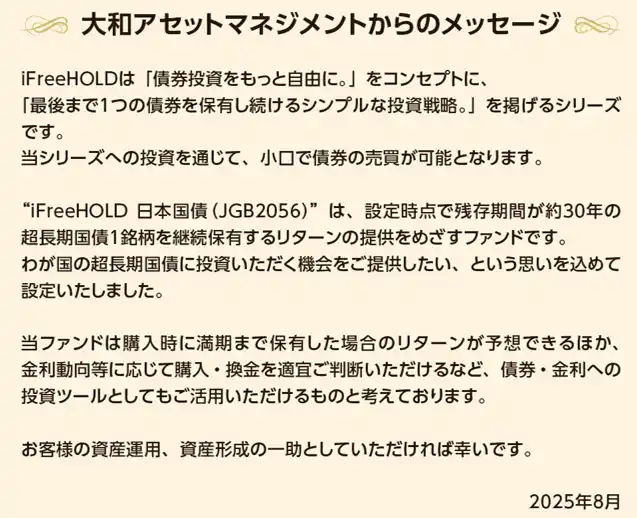 このたび、大和アセットマネジメント株式会社は、2025年8月21日に「iFreeHOLD 日本国債(JGB2056)」(以下、「当ファンド」)を設定します。 |