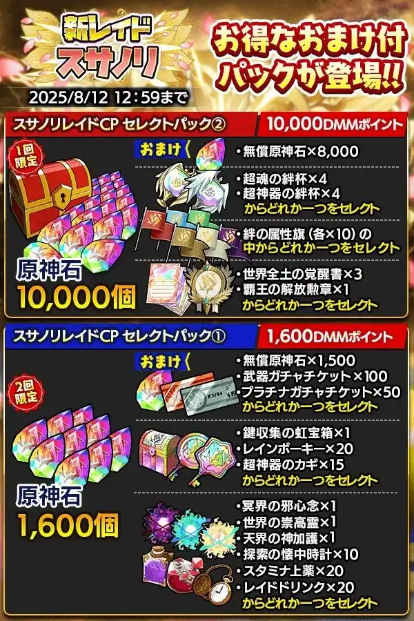 原神石に加えて、ガチャチケットや限界突破アイテムなど、お好きなアイテムを選択できる「スサノリレイドキャンペーンセレクトパック」が2種登場! |