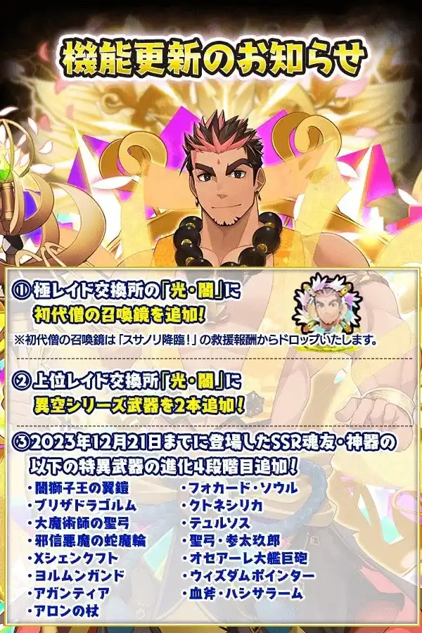 2023年12月21日までに登場したSSR魂友・神器の特異武器の進化4段目を追加! |