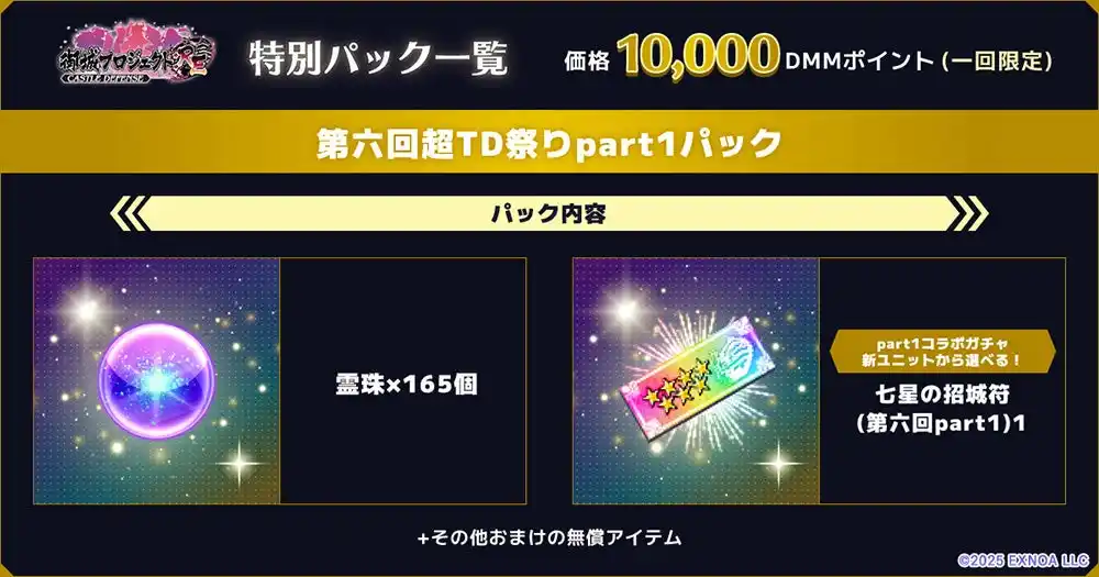 イベント開催期間中、1回限定で「霊珠×165個」などの貴重なアイテムやpart1コラボガチャで登場する最高レア新キャラクターから選べるチケットアイテム、その他便利アイテムがパックとなった「第六回超TD祭りpart1パック」(価格:10,000DMMポイント)で販売します。 |