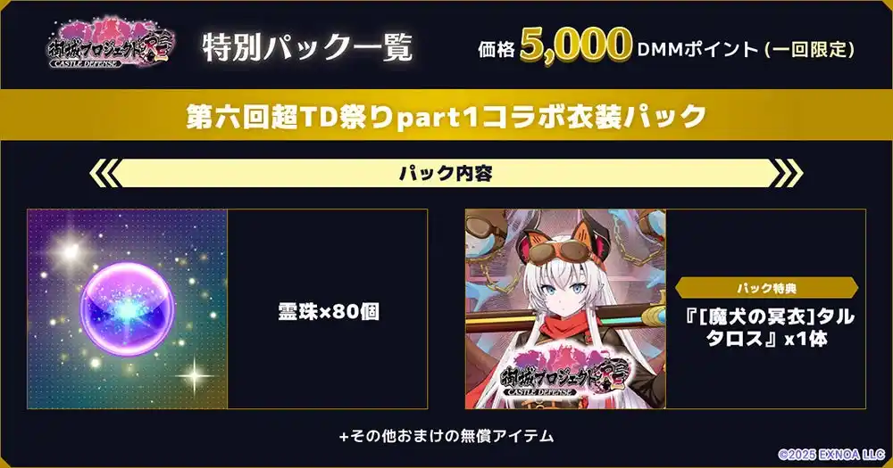 イベント開催期間中、1回限定で「霊珠×80個」と限定コラボキャラクター「[魔犬の冥衣]タルタロス」、その他便利アイテムがパックとなった「第六回超TD祭りpart1コラボ衣装パック」を5,000DMMポイントで販売します。 |
