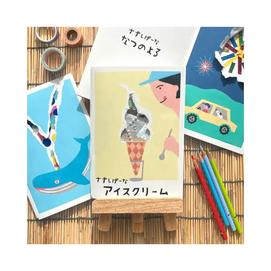 「やぶるうまれる絵本」作者による オリジナルの絵本をつくるワークショップ。 今回は、なんだか見ているだけで"すずしげ~"な気持ちになる夏らしいイラストを描き下ろし! 3種のイラストの一部をびりりとやぶると...何かがうまれる!描いて、貼って、やぶって、あそびながらいっしょに作ろう。 帰ってからも、お家で飾れるミニイーゼル付き。 |