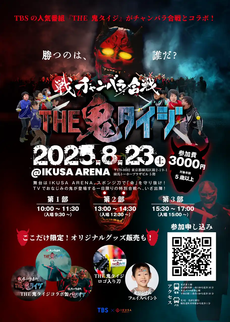 あそび総合カンパニー株式会社IKUSA(本社:東京都豊島区、代表取締役:赤坂大樹、以下IKUSA)は、株式会社TBSホールディングス主催のもと、TBSの人気番組『THE 鬼タイジ』と、累計10万人以上が体験したIKUSAの人気合戦アクティビティ「チャンバラ合戦(R)」がコラボレーションしたリアル体験型イベント『チャンバラ鬼タイジ』を開催いたします。 本イベントは、2025年8月23日(土)に東京都練馬区の「IKUSA ARENA」にて実施いたします。 |