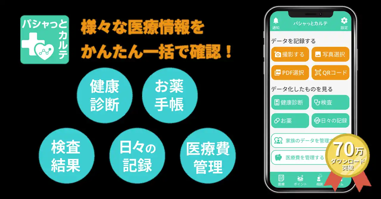 この度取材いただいた『パシャっとカルテ』は、健康にまつわるPHRデータを管理できる一般消費者向けのアプリです。健康診断や検査の結果、病院などで処方されるお薬などの医療情報はもちろんのこと、血圧や体重 ‧ 体温などの日々の健康状態や医療費を、ユーザー様がご自身のスマートフォンで管理することが可能です。「操作性」や「使いやすさ」から、現在では70万ダウンロードを達成し、年齢問わず幅広い世代の方にご利用いただいております。 |