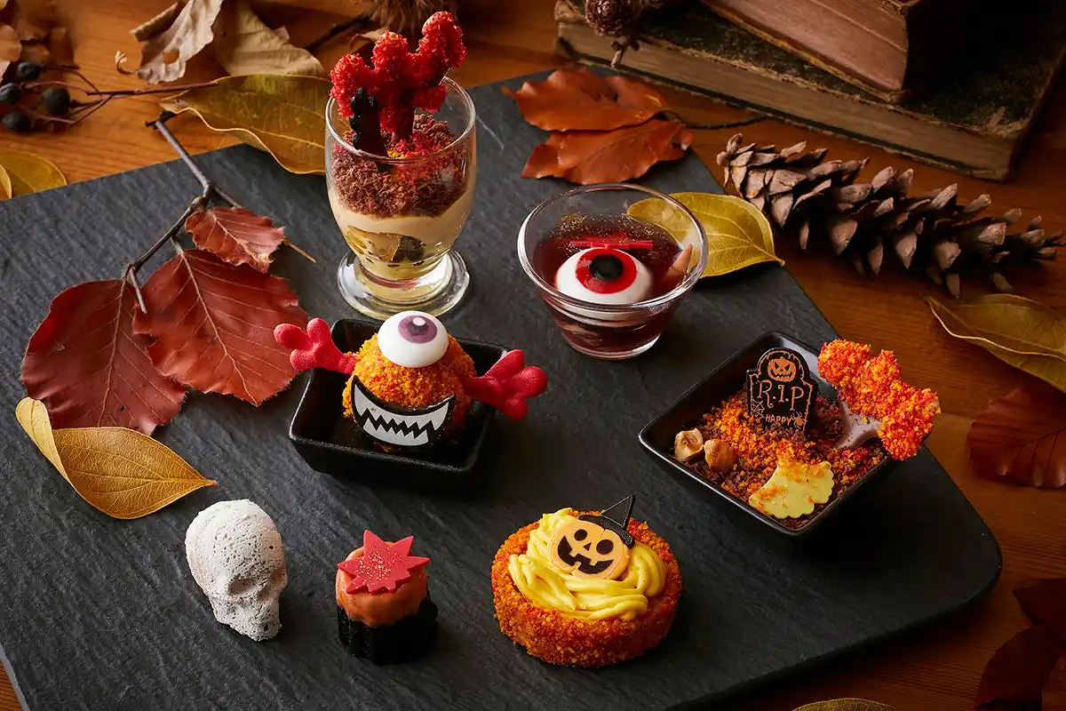 | モンスターが紅葉を観にやってきた様子をイメージしたスイーツは7種類。キャラメリゼした洋梨とクリームが層をなす、紅葉に染まる秋の森を思わせるトライフルからはチョコレートの手がひょっこりと顔を出し、香ばしいナッツがアクセントのかぼちゃプリンは墓地をモチーフに。ほっくりとした甘さの「スイートポテトタルトとかぼちゃのクリーム」には愛らしいかぼちゃお化けの表情を添えて、艶やかに煌めく「無花果のコンポートジュレ」には、目玉のマシュマロが浮かび怪しげな雰囲気を演出。モンスターの姿をした「チョコレートチーズケーキ」やドクロをかたどったマドレーヌなど、ハロウィン気分を盛り上げる秋のスイーツがスタンドをにぎやかに彩ります。 | ||||||||||||||