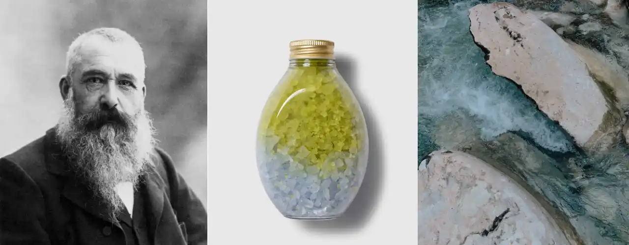 1.睡蓮の作者「クロード・モネ」2.2層のバスソルト3.自然界に豊富に存在するミネラル成分「シリカ」イメージ |