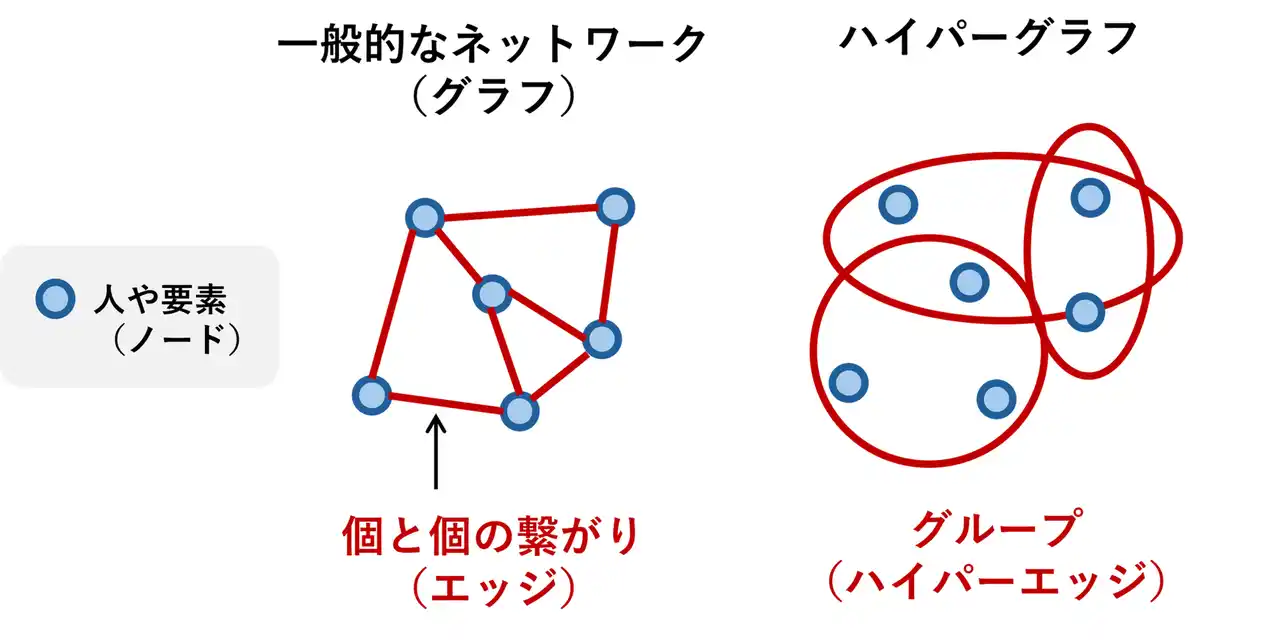 赤い楕円(ハイパーエッジ)は「グループ的な関係性」を表しており、複数のノードが同時に関係し合う複雑な構造を可視化しています。従来の“1対1”のネットワークでは捉えきれない、現実に近いつながりを表現可能です。 |