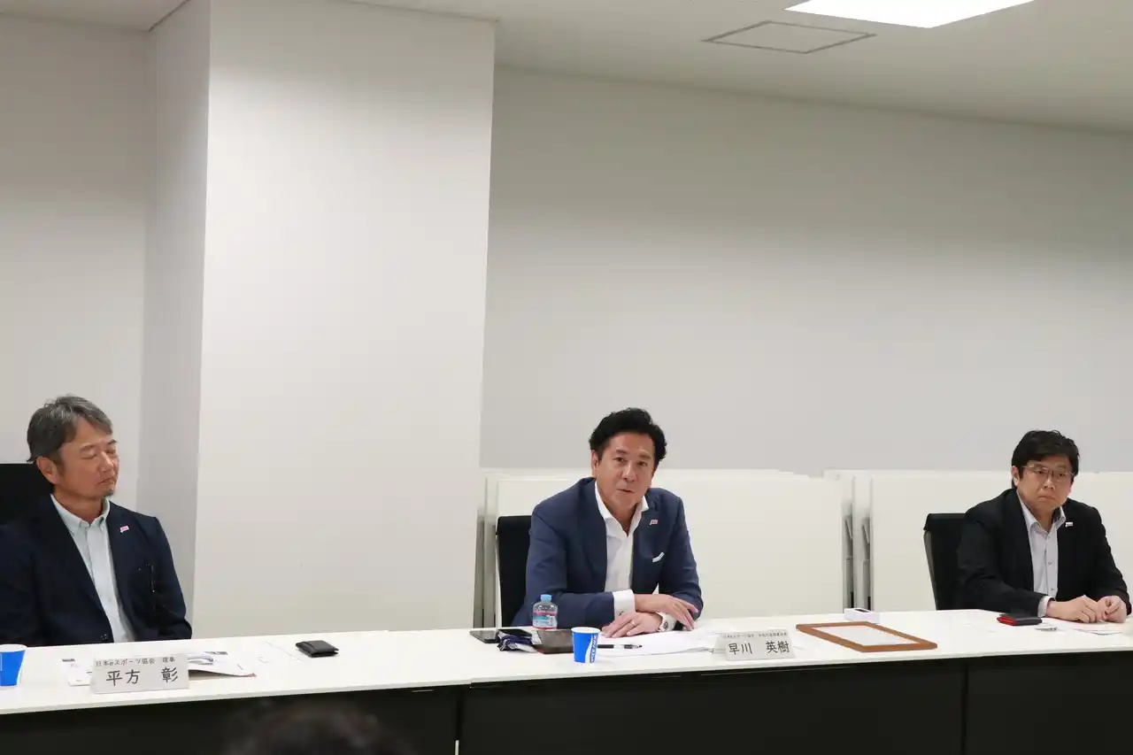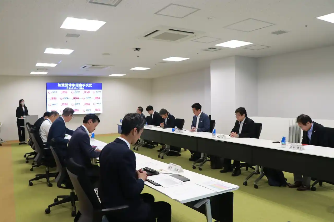 | 手交式は、JSPOにおいて行われ、JSPO・森岡専務理事からJESU・早川会長に加盟団体承認書が手渡されました。手交式の後は、両団体の理事も交えて、国内外におけるeスポーツ競技の動向や、部活動推進をはじめとするeスポーツ普及・振興、JSPOの指導者育成制度などについて幅広く意見交換を行いました。 | |||||||||