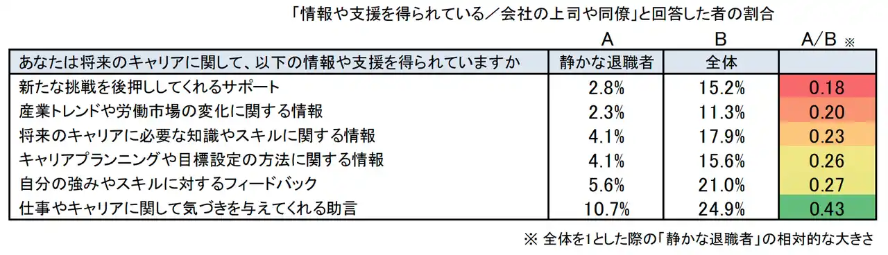 以下では「あなたは将来のキャリアに関して、以下の情報や支援を得られていますか」という設問において上司や同僚から「情報や支援を得られている」と回答した者の割合について、“静かな退職者と見なせる群”と全体を比較しています。各項目では、情報や支援の種類を示しており、A列では“静かな退職者と見なせる群”の結果、B列では全体の結果を示しています。 |