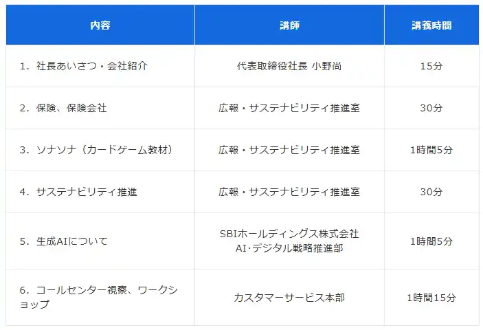 また、SBIグループとSBI損保のサステナビリティに対する考え方や具体的活動、生成AIの活用状況などの紹介を通じて、それぞれの分野についても理解を深めていただくとともに、教育現場での可能性についても考えていただきました。 |